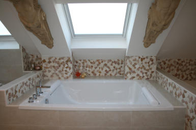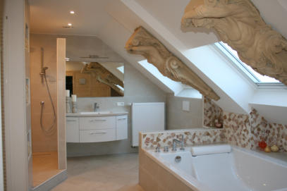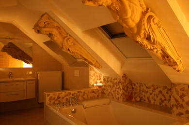Oder Ihr geniesst ein heisses Bad, in der wirklich riesigen Doppelbadewanne, in der Ihr Euch,