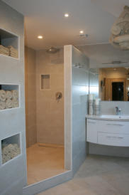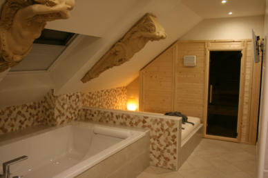 Von Sauna, Doppelbadewanne, großzügiger offener Regendusche und gemütlicher Liege mit TV.